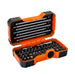 Sættet indeholder både standard- og specialbits — fx ligekærv, Phillips, Pozidriv, Torx, tamper-resistente Torx, hex og Robertson — samt bitsholder og topadapter, så du hurtigt kan skifte tilbehør uden at miste greb eller effektivitet.